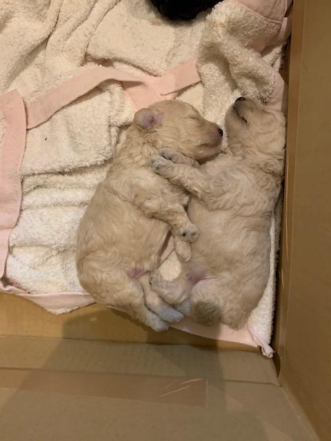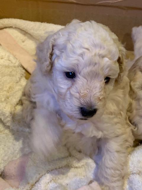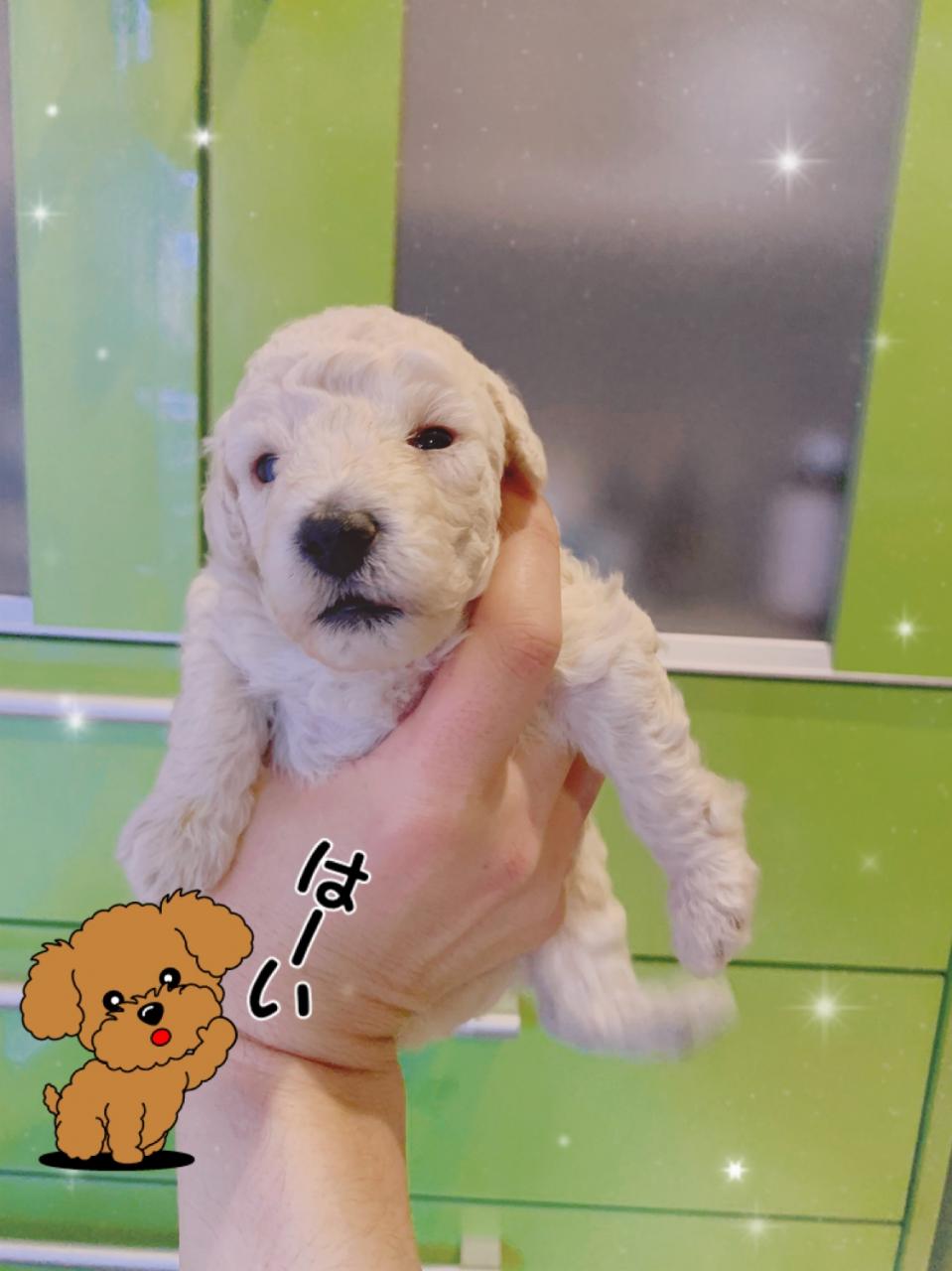 クリームの男の子です。当犬舎では久しぶりのクリームのベビーちゃんが産まれました。白くま君のようでかわいい~頑張って歩いていますが気持ちが焦ってつまづくの。被毛がカールしてきてかわいいよ。。